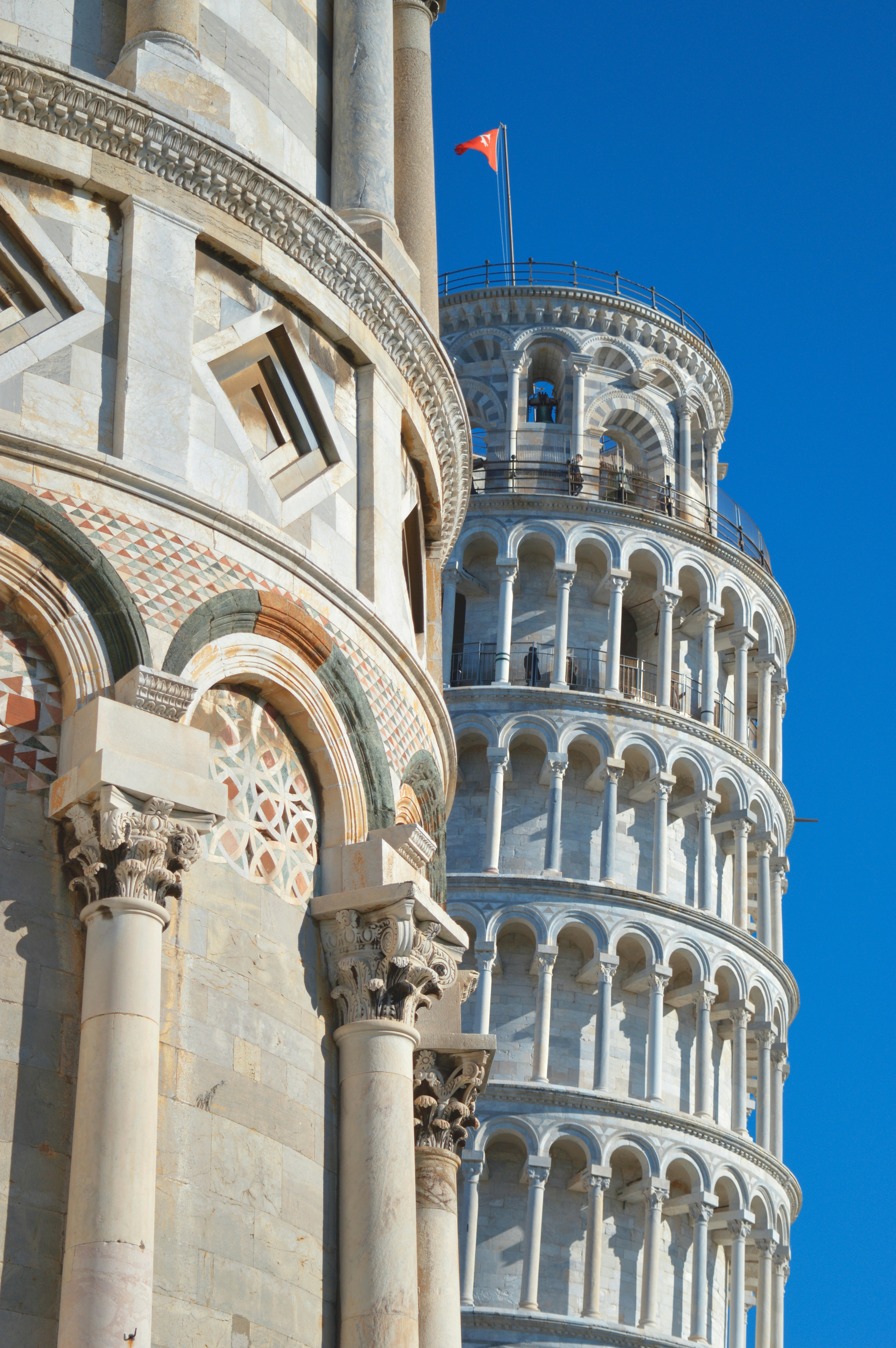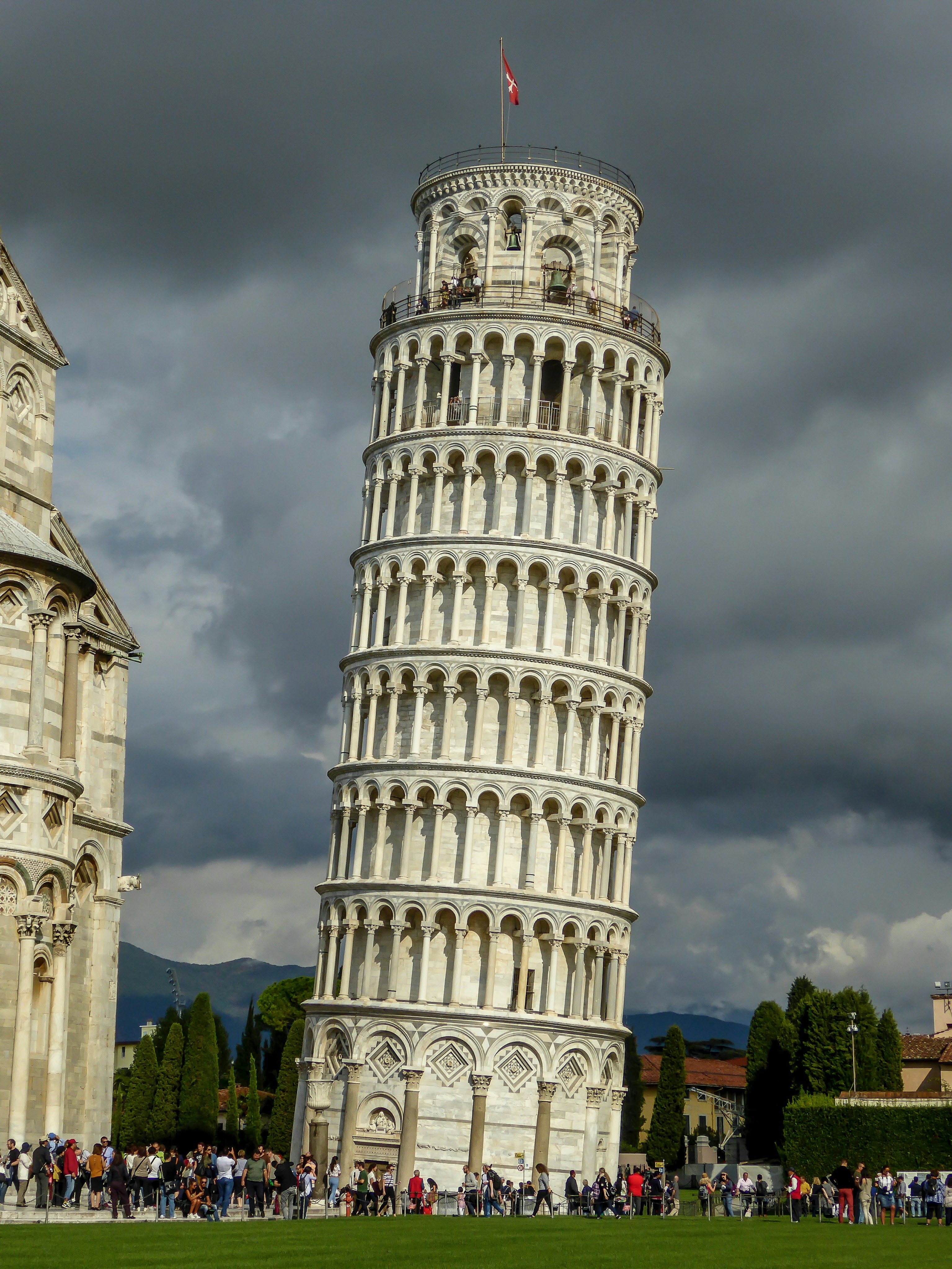 The Leaning Tower of Pisa, or simply the Tower of Pisa, is the campanile, or freestanding bell tower, of the cathedral of the Italian city of Pisa, known worldwide for its nearly four-degree lean, the result of an unstable foundation.